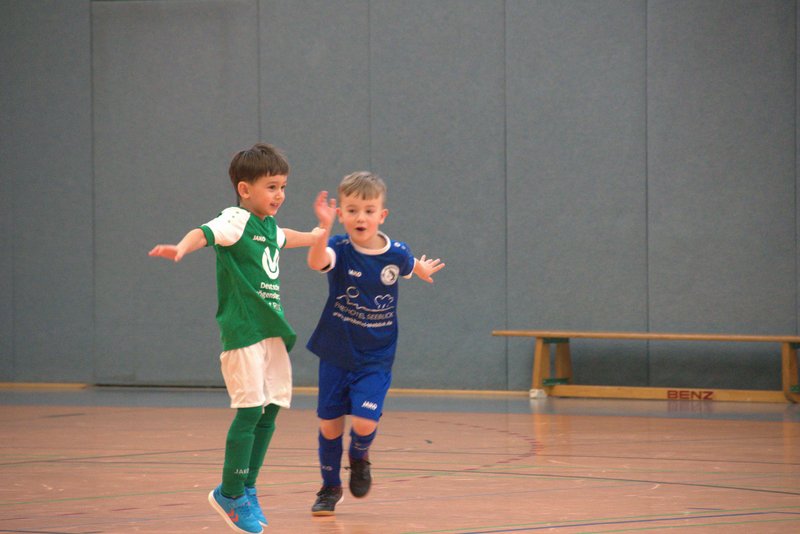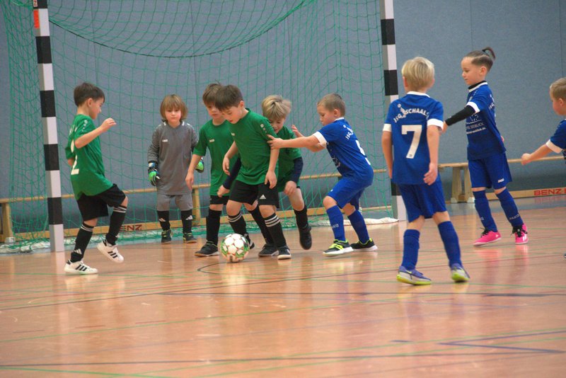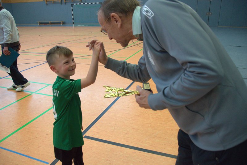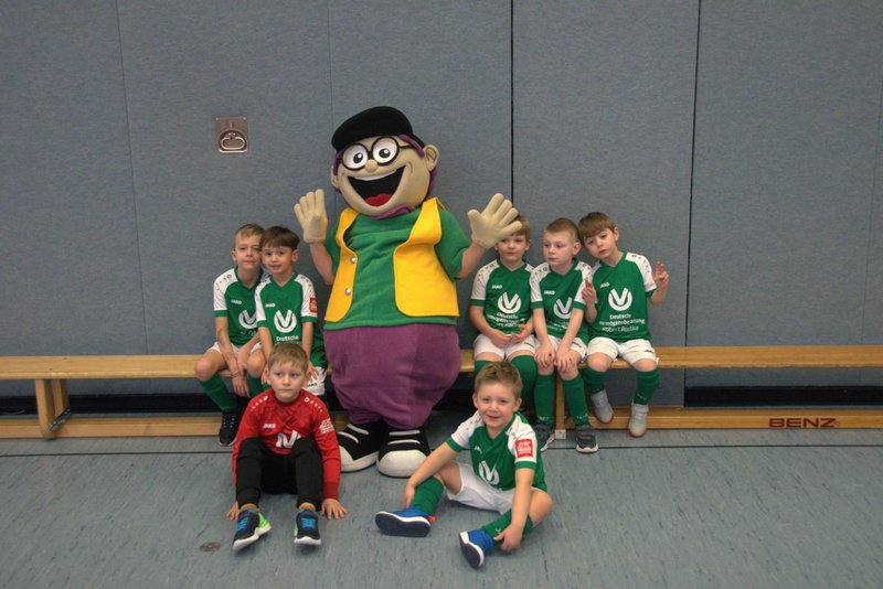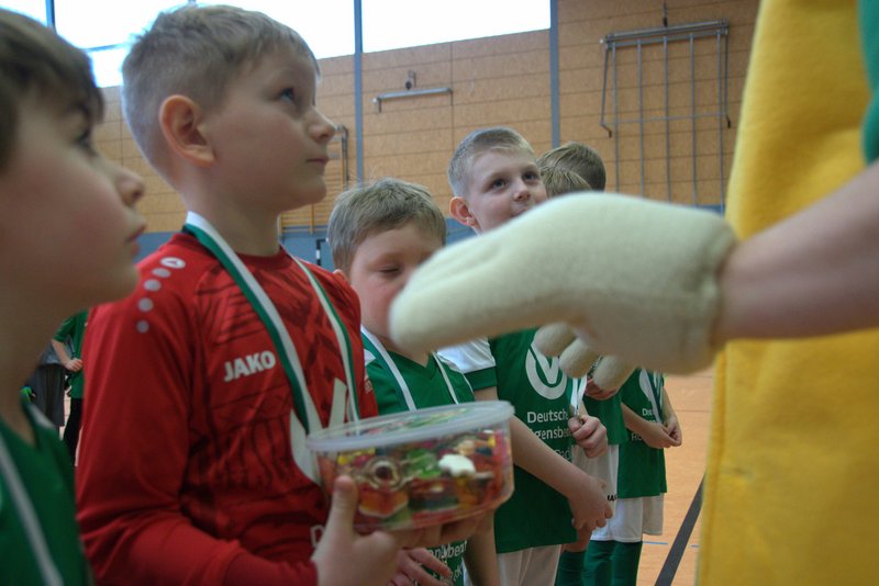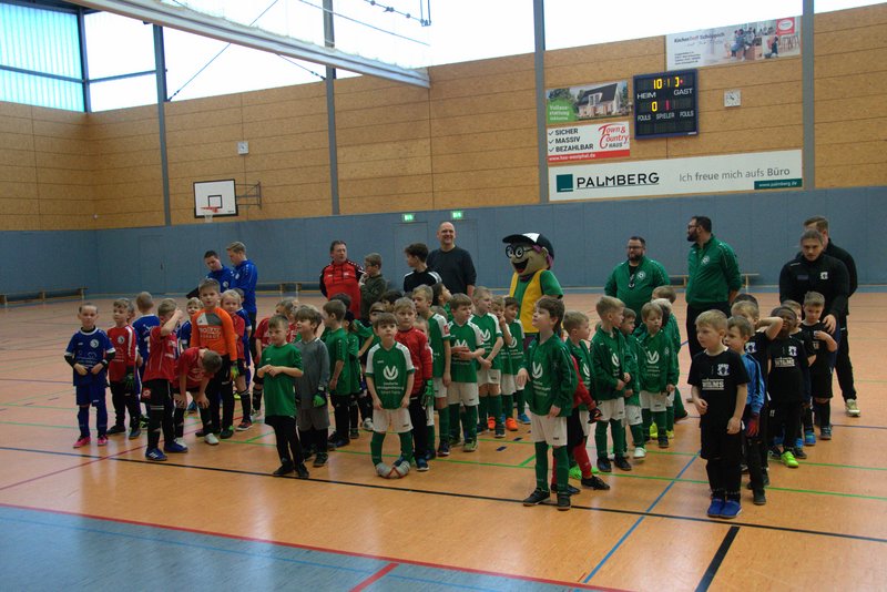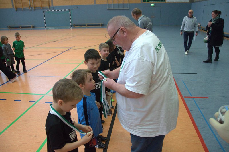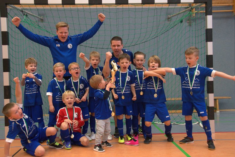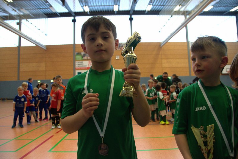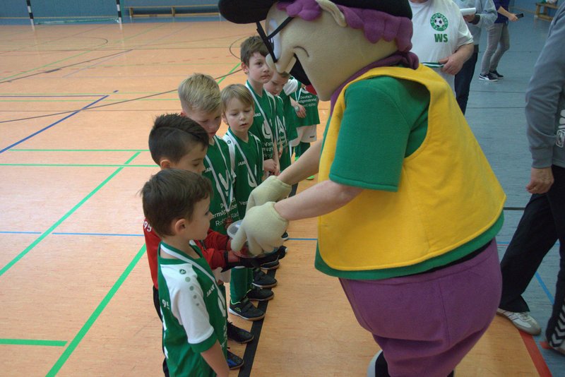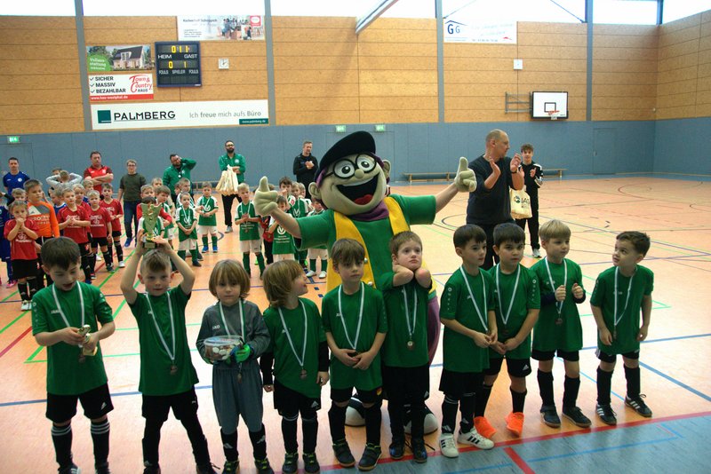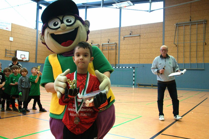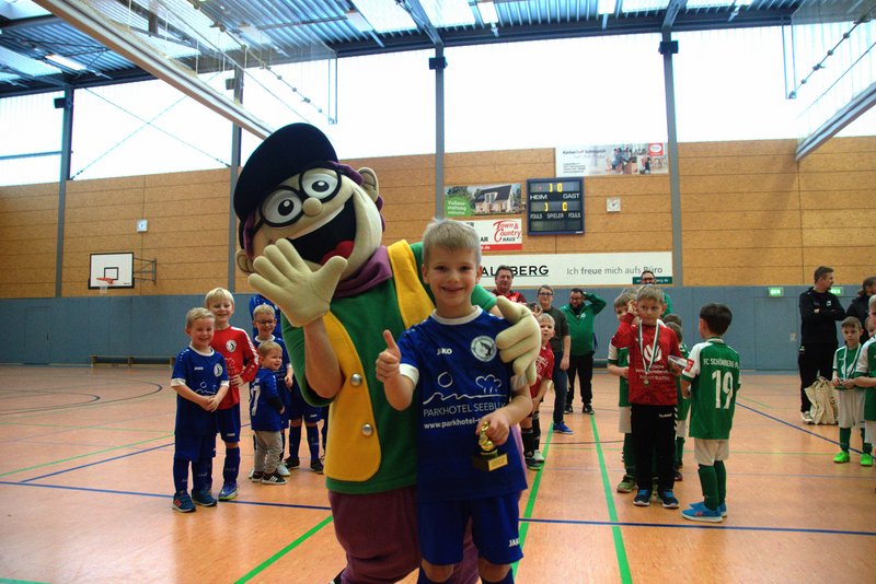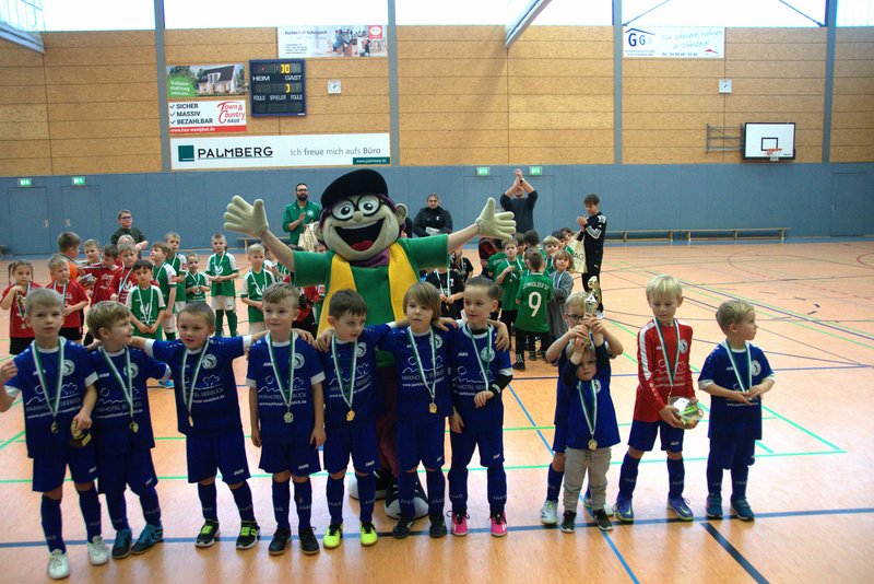 Gleich zu Beginn des neuen Jahres feierte der FC Schönberg eine gelungene Premiere. Sechs Mannschaften bewarben sich am Sonntag beim 1. IAG-Bambini-Cup der G-Junioren, der jüngsten Altersklasse des Vereins. Für zusätzliche Unterhaltung und Freude bei den Mädchen und Jungen sorgte das Maskottchen der Ihlenberger Abfallgesellschaft. Während auf der Tribüne bei den Eltern, Großeltern und Geschwistern eine tolle Stimmung herrschte, feierte die JSG Schaalsee einen souveränen Start-Ziel-Sieg und gewann alle fünf Spiele. Silber holte sich die SG Schlagsdorf, Bronze der Eichholzer SV. Aber auch alle anderen Akteure durften sich bei der Siegerehrung über eine Medaille und ein Überraschungspaket freuen. Besonders happy waren am Ende Felix Krause (FC Schönberg I) über seinen Pokal als bester Torhüter, Anton Siemers (JSG Schaalsee) als bester Torschütze mit 8 Treffern und Reto Sonn Luther (Eichholzer SV), der als bester Spieler ausgezeichnet wurde. Insgesamt fielen in den 15 Spielen 30 Tore.