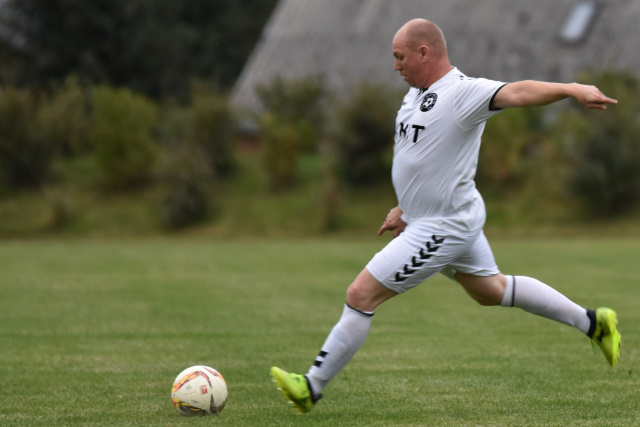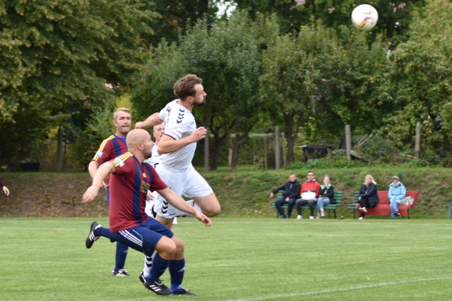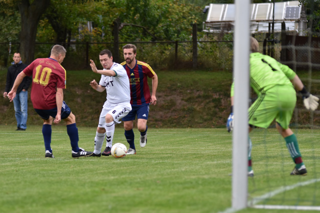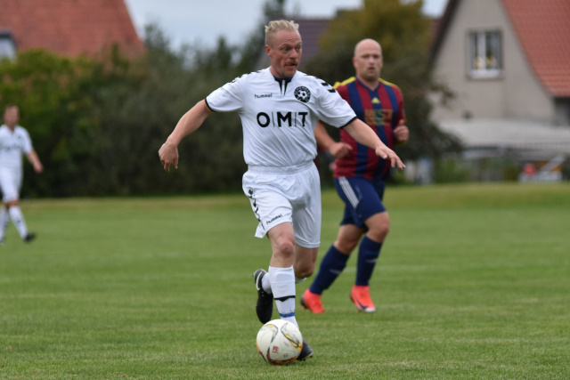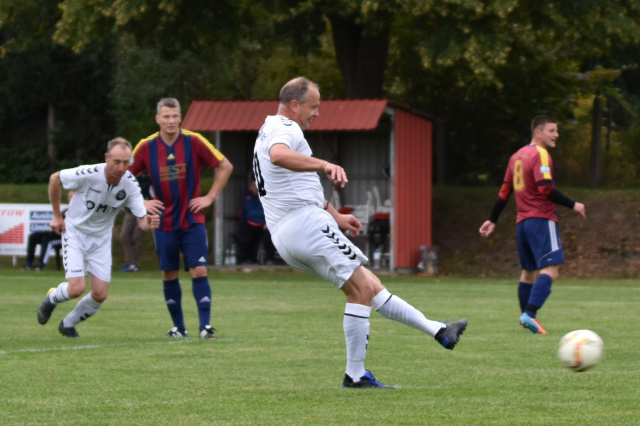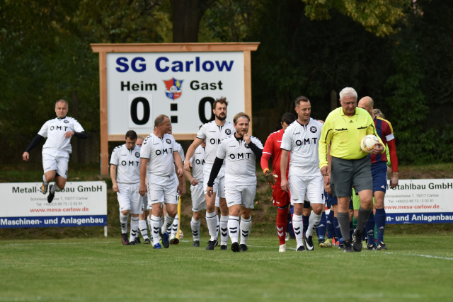 Die Partie wurde dann etwas später angepfiffen und begann abwechslungsreich. Doch nach ersten unruhigen Minuten nahmen unsere Alten Herren das Zepter in die Hand. Gute Ballverlagerungen und Vorstöße in den gegnerischen Strafraum brachten Carlow in Bedrängnis. In der 18. Minute tankte sich Björn Meier in die „Box“, zog ab und traf vorerst nur die Latte. In der 21. Minute konnte Thomas Liedtke dann aber eine Flanke von links per Kopf verwandeln. Schönberg blieb am Ball und nur 60 Sekunden später wiederholte sich dieser Vorgang. Diesmal Flanke von rechts, am langen Pfosten stand Michael Pekrun völlig frei und konnte locker zum 2:0 netzen. Im weiteren Spielverlauf ließen unsere Maurinekicker kaum was anbrennen. In der 28. Minute tauchte dann erneut Thomas Liedtke im (oder war es am?) Strafraum auf, wurde in den Hacken getroffen. Ein Pfiff. Elfmeter. Carlow wollte es nicht fassen, aber da hatte sich Roland Schneider den Ball längst zurecht gelegt und den Spielstand eiskalt aus elf Metern zum 3:0 geschraubt. Und quasi mit dem Halbzeitpfiff war es dann wieder der glänzend aufgelegte Roland Schneider, der nach zwei, drei erfolglosen Klärungsversuchen der Gastgeber die Kugel ins Netz nagelte. 4:0 zur Halbzeit, vonwegen „ein Unentschieden reicht uns…“!