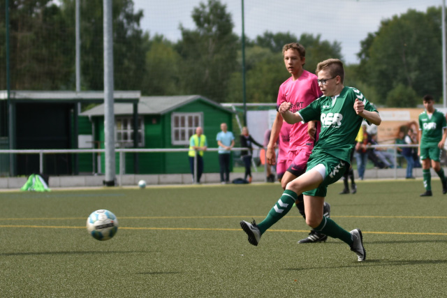 Am Ende hingen sie leider, die Köpfe der Mädchen und Jungs der B2. Das Team von Trainer Kai Denzin und seinem Co Niko Schmidt kämpfte lange tapfer gegen ein gutes Gästeteam der SG Lübstorf/Bad Kleinen. Der in pink gekleidete Gegner konnte früh in Führung gehen. Da stand unsere B2 noch nicht wirklich auf dem Platz. Doch nach und nach zeigte das Team, geführt von Kapitän Florian Sommerfeld, Moral und biss sich in die Partie. Die ersten Torschüsse waren noch harmlos. Doch in Minute 19 bereitete Marlon Deven Bethke traumhaft für Tim Kantorzik vor, der im Strafraum eiskalt zum 1:1 ausglich. Danach hielt der FC Schönberg tapfer gegen robuste Gegenspieler das Unentschieden. In der 32. Spielminute aber klingelte ein Sonntagsschuss der SG LBK in unserem Kasten und es stand 1:2. In der Halbzeitpause setzte dann Regen ein…