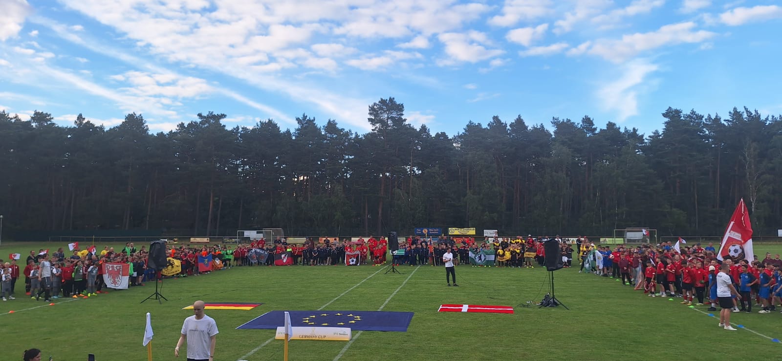 Nach einer erfolgreichen Anreise startete das Wochenende am Freitag mit der obligatorischen Eröffnungsfeier und dem Einlaufen der U9 – U13 Junioren. Im Anschluss wurde, wie bei einem richtigen Länderspiel sowohl die dänische, als auch die deutsche Nationalhymne gespielt. Zudem zeigte der Freestyler Florian Halimi eine Fußballshow, von der alle Kids begeistert waren!