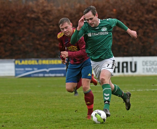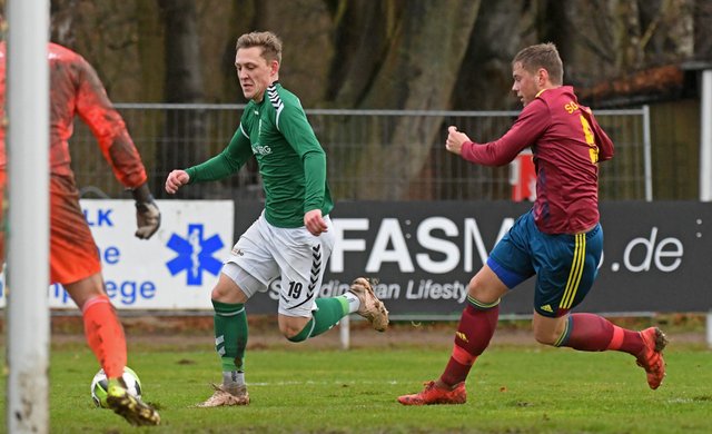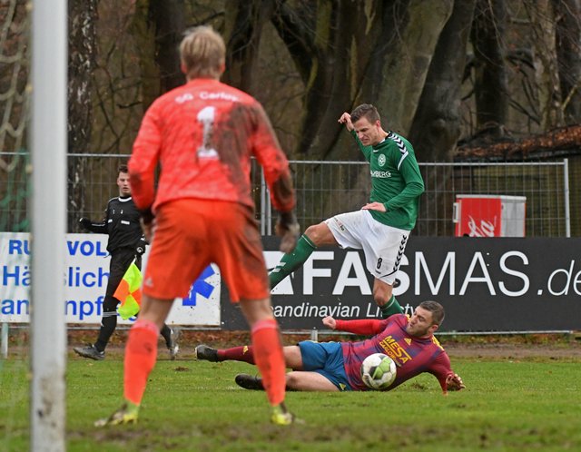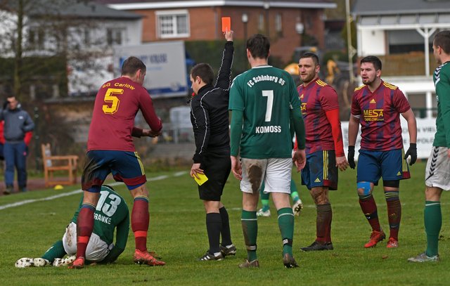 Die Anhängerschaft des FC Schönberg 95 erlebte heute einen relativ entspannten letzten Spieltag des Jahres 2019. Denn die Gastgeber sorgten mit einem Doppelschlag in der Anfangsphase schnell für klare Verhältnisse. Zunächst traf Hannes Komoss per Kopf als die Gäste beim Versuch, eine Ecke zu klären, einen Querschläger produzierten. Und dann markierte Simon Leu mit einem wunderbaren Ball von der rechten Außenbahn das 2:0. Christian Worms konnte sich strecken wie er wollte – die Kugel senkte sich passgenau ins Dreiangel. Gut 10 Minuten später ging der Versuch, den Ball aus dem eigenen Strafraum zu spielen, gehörig in die Hose. Schönberg setzte Carlow dabei so massiv unter Druck, dass Marcel Nagel seinem Gegenspieler das Leder abluchsen konnte und dann ging’s ganz schnell. Eine Flanke von der Grundlinie brachte Hannes Komoss in Schussposition und schon war’s erneut passiert. Auch bei einer Woreschck-Ecke in der 26. Minute war der Ball drin, bevor die Carlower den Braten überhaupt gerochen hatten. David Rosinski bekam für seine Flanke auf den langen Pfosten alle Zeit der Welt, weil die SG sich noch sortierte und Hannes Komoss konnte ohne Bewacher einköpfen.
