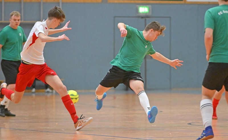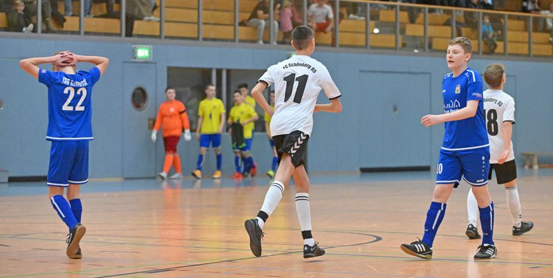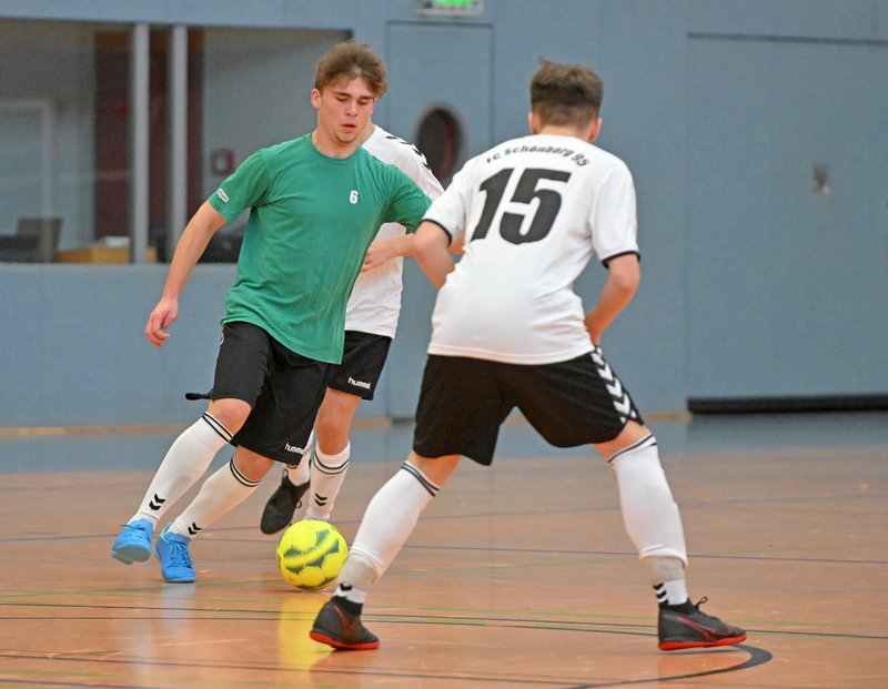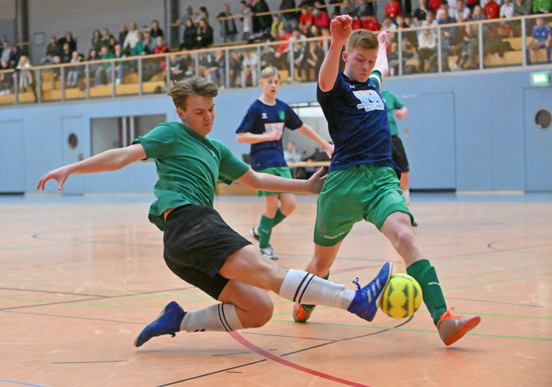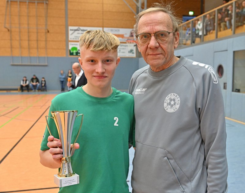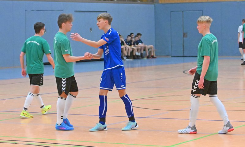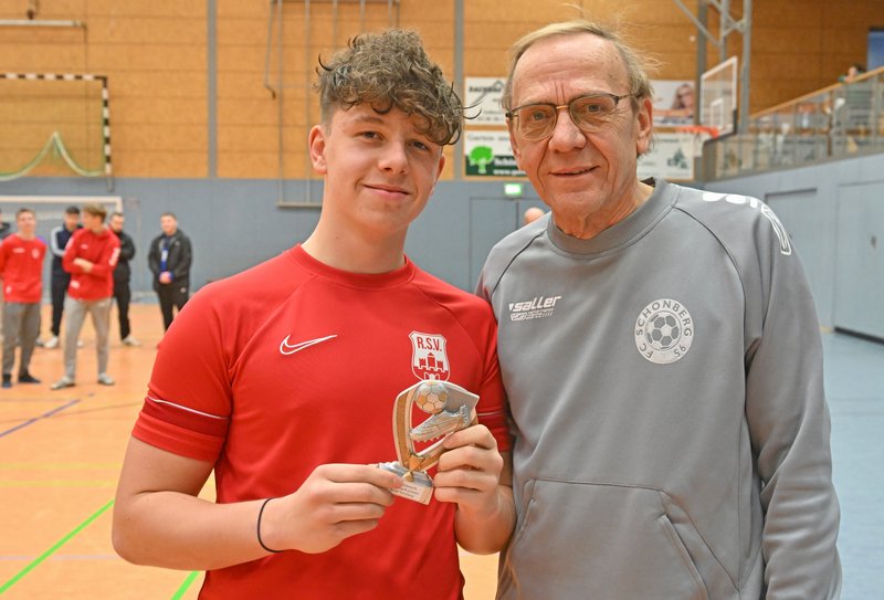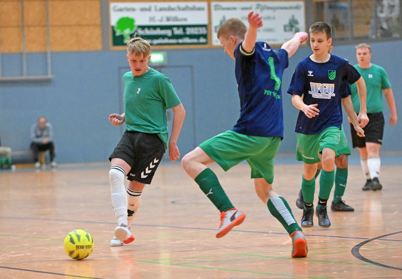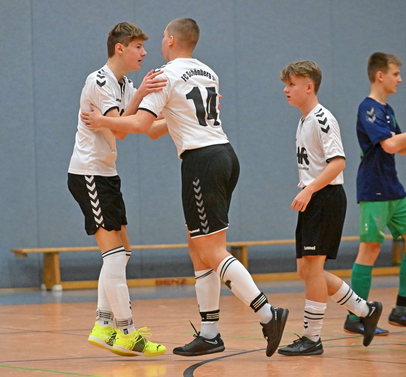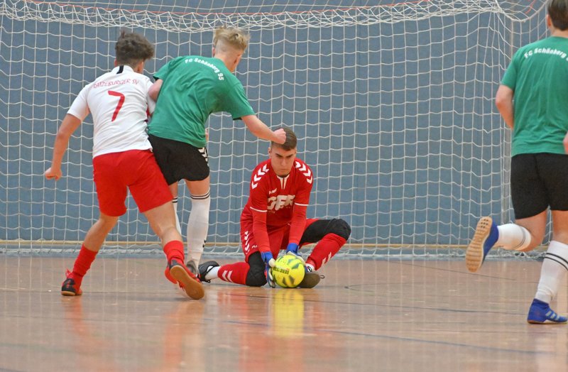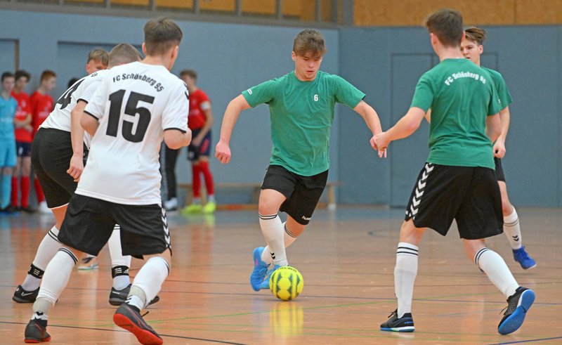 Dieses Trio lieferte sich bis zum Schluss der 28 Spieler, die acht Mannschaften spielten dabei jeder gegen jeden, einen spannenden Kampf, der erst auf der Zielgerade entschieden wurde. Vor der abschließenden letzten Runde sah der PSV Wismar nach dem glücklichen 1:0 gegen Team A des FC Schönberg schon fast wie der sichere Sieger aus. Während der Ratzeburger SV seine „Hausaufgaben“ in seinem letzten Spiel gegen Eintracht Groß Grönau (7:0) souverän löste, sorgte anschließend das B-Team des FC Schönberg, das keineswegs enttäuschte, für die Überraschung des Turniers. Mit 6:0 schossen sie den PSV Wismar zum Abschluss aus der Halle, sehr zur Freude der Ratzeburger und der Kollegen vom A-Team. Um doch noch den Titel zu verteidigen, mussten allerdings das A-Team im letzten Spiel mit elf Toren Unterschied gewinnen, was eine schier unmögliche Aufgabe war. Mit 4:1 überflügelten dann die Schönberger aber noch den PSV Wismar und belegten Platz 2. Dasa B-Team belegte einen respektablen 5. Platz.