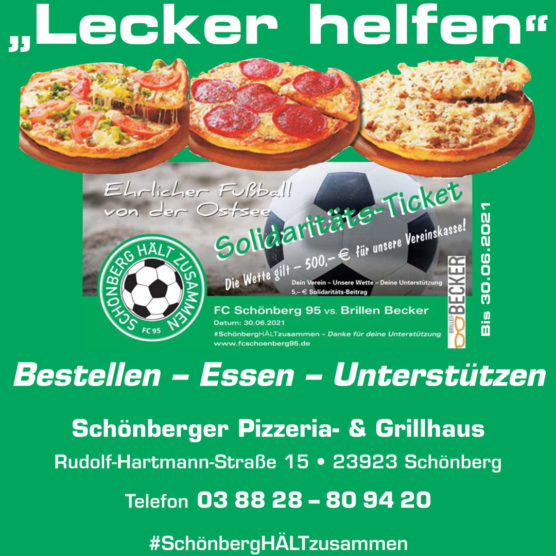 Ab einem Bestellwert ab 40€ oder einer Bestellung von 5 Pizzen oder einer Familienpizza bekommt ihr zusätzlich eine 1L Flasche Cola sowie ein Solidaritätsticket für unsere Wette gegen Uwe Becker gratis zu eurer Bestellung dazu. Die 5€ für das Solidaritätsticket gibt das Schönberger Pizzeria & Grillhaus anschließend an den FC Schönberg 95 weiter.