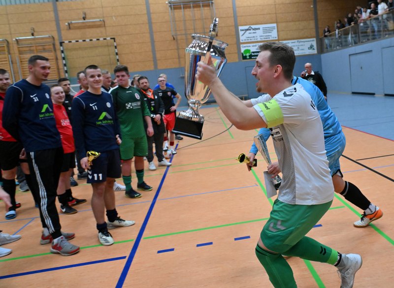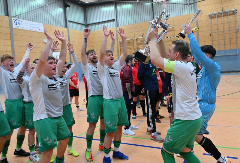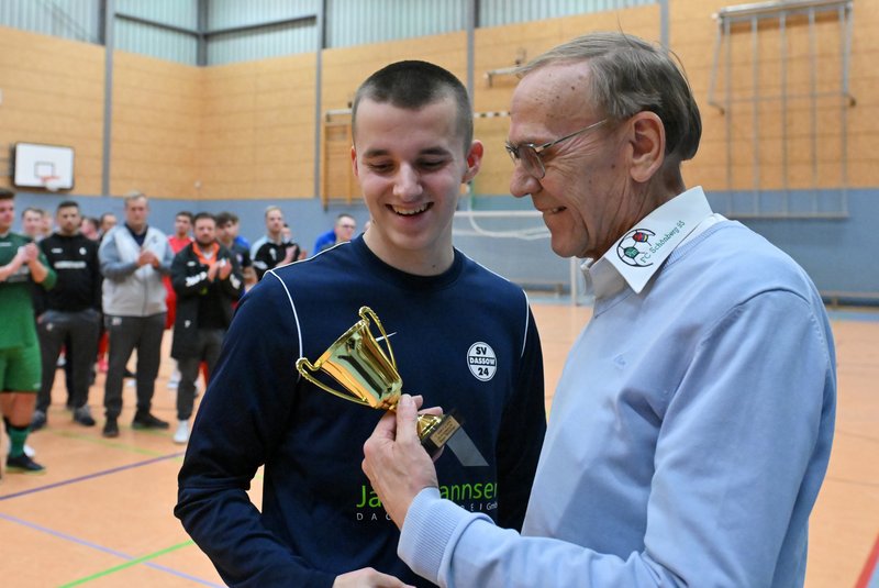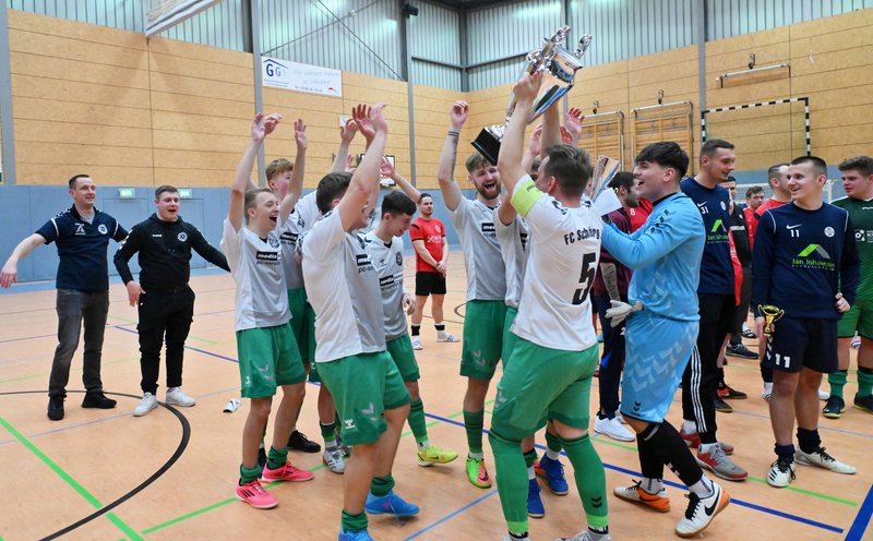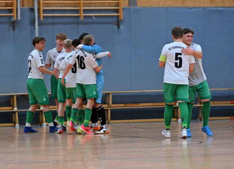 In diesem Jahr ließen sich die Grün-Weißen dann aber nicht wieder von den Carlowern überrumpeln. Mannschaftlich geschlossen und hochkonzentriert ließen sie in der Abwehr nur wenig zu und erarbeiteten sich selbst Möglichkeiten zur Führung. Gut 3 Minuten vor der Schlusssirene verschaffte sich Moritz Jeske mit einer Körpertäuschung eine gute Schussposition und er traf platziert zum 1:0. Die Schönberger brachten das knappe Ergebnis gemeinsam über die Zeit, auch weil Bennet Wedhorn, später als bester Torhüter des Turniers ausgezeichnet, noch einmal mit einem Reflex seinen Kasten sauber hielt.