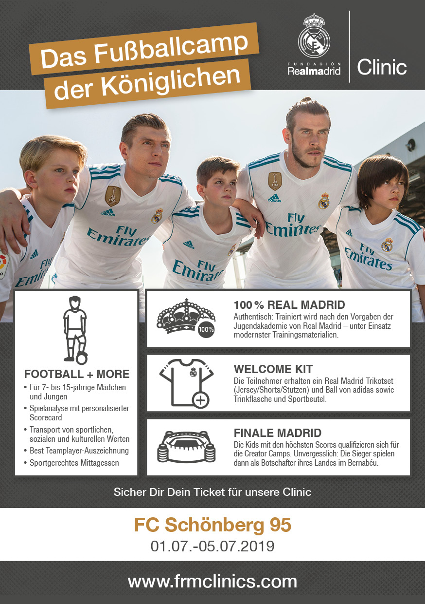 In der ersten Sommerferienwoche, vom 01. bis 05. Juli 2019, wird die Fußballschule der Fundacion Real Madrid wieder professionelles Fußballtraining für Kinder im Alter von 7 – 15 Jahren in Schönberg anbieten. Dabei erwartet die Teilnehmer auch 2019 wieder neben dem täglichen Training eine Vollverpflegung während der Trainingstage und zusätzlich ein Premium-Outfit von Real Madrid inkl. Adidas-Trainingsball sowie eine Real Madrid-Trinkflasche.