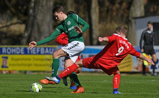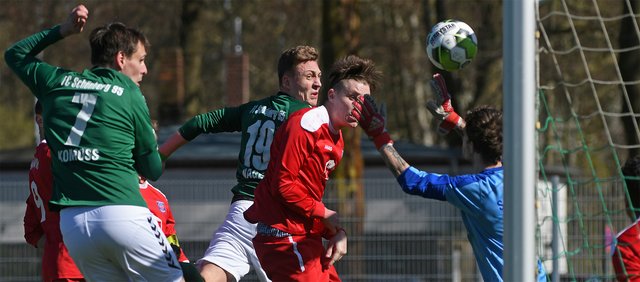 Schönberg brauchte eine knappe Viertelstunde, um ins Spiel zu kommen. Ein guter Freistoß von Thomas Aldermann war dann aber scheinbar das Signal zum Aufbruch, denn die Gastgeber zogen das Tempo nun merklich an. Finn Lukas Burmeisters artistischer Einsatz hätte kurz darauf fast das 1:0 bedeutet, doch Salifu Jammeh klärte kurz vor der Torlinie. Nach zwei weniger effektiven Ecken übergab Marcel Nagel seinen Job als Schütze an Nick Heymann und diese Entscheidung sollte sich schnell bezahlt machen. Schon beim ersten Versuch brachte Heymanns Ecke ordentlich Konfusion in den 16er der Gäste und beim zweiten Anlauf kam der Ball perfekt auf den Kopf von … Marcel Nagel! 1:0 nach 21 Minuten und auch in der Folgezeit ging es praktisch nur in eine Richtung. Bis zur Pause kam aber trotz guter Möglichkeiten kein weiterer Treffer dazu. Erst als Marvin Worreschck in Strafraum von Dennis Kettler gefoult wurde, machte Hannes Komoss per Elfmeter das überfällige 2:0.