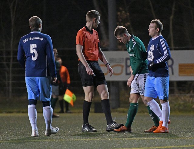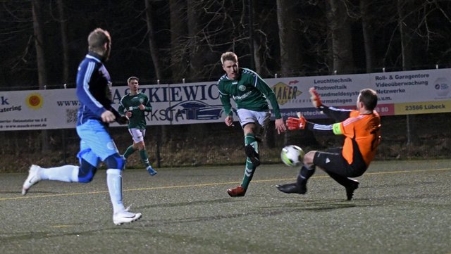 Nach vielen guten Chancen für die Platzherren, bei denen sich vor allem der Gäste-Keeper mit starken Paraden auszeichnen konnte, bekam plötzlich der TSV Schlutup eine Riesenchance zur Führung, vergab diese aber. 3 Minuten später schlug Marcel Sven Meier jedoch aus vollem Lauf eine Flanke von der Grundlinie und Finn Burmeister stand am kurzen Pfosten goldrichtig.