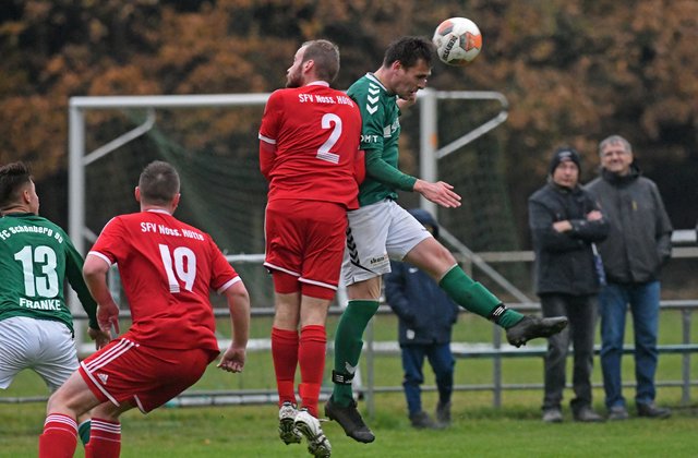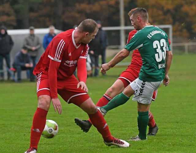 Wie erwartet igelte sich der SFV nicht in der eigenen Hälfte ein. Ganz im Gegenteil – die quirlige Offensivabteilung um Dariusz Kostyk stellte Schönbergs Abwehr immer wieder vor Probleme und wer weiß, was ein zu diesem Zeitpunkt sicherlich verdientes 1:0 für den weiteren Spielverlauf bedeutet hätte. Aber unser Torwart Przemyslaw Szymura spielte gewohnt stark und hielt seinen Kasten gleich mehrfach sauber. Und weil Nick Heymann in der 26. Minute aus 20 Metern ganz genau Maß nahm und dem ehemaligen Schönberger Paul-Friedrich Kornfeld im Tor der Gastgeber mit seinem Schuss ins Dreiangel keine Abwehrchance ließ, lagen die Maurine-Kicker plötzlich sogar vorn. Kurz vor der Pause bekam Marcel Behm auch noch eine gute Möglichkeit zum 2:0, er verfehlte das Ziel jedoch. Es wäre es Guten vielleicht auch wenig zu viel gewesen.