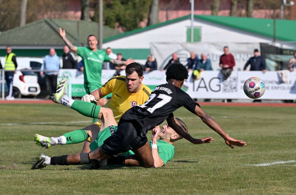 Es gibt Tage, an denen einfach alles passt. Das Wetter, die Kulisse, das Spiel. Und am Ende auch noch das sensationelle Ergebnis: der FC Schönberg 95 steht nach dem 1:0 Erfolg gegen den Oberligisten SG Dynamo Schwerin im Halbfinale des Landespokals. Dabei waren die Maurine-Kicker im ersten Durchgang dem Favoriten aus der Landeshauptstadt durchaus ebenbürtig und sie erspielten sich letztlich sogar die besseren Möglichkeiten. Daniel Wobig traf nach 25 Minuten in aussichtsreicher Position den Ball nicht richtig und Tom Jurga scheiterte in der Nachspielzeit der ersten Halbzeit am stark reagierenden Ibrahim Suaib. Eine Viertelstunde zuvor war eben dieser Tom Jurga frei vor dem Tor schon einmal dabei, sich die Ecke auszugucken, als Mohand Almansori ihn von hinten von den Beinen holte. Schiedsrichter Ole Donner zeigte sofort auf den Punkt, Felix Kaben übernahm die Verantwortung und er traf souverän zum 1:0 für den FC Schönberg 95.