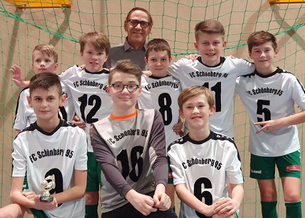 „Ich bin total stolz auf meine Jungs. Was sie am Wochenende geleistet haben, ist einfach klasse“, gab es viel Lob von Trainer Wilfried Rohloff nach einem zweitägigen Turnier-Marathon für die D1-Junioren des FC Schönberg. Beim hochkarätig besetzten Budenzauber des SV Plate am Sonnabend in Banzkow schafften die Jungs, nicht zuletzt dank einer starken Leistung ihres Torhüters Maurice Plath sogar den Sprung ins Finale. Dort hatten sie allerdings gegen den FC Hansa Rostock keine Chance und unterlagen 1:5. „Das schmälert aber keineswegs die tolle Leistung unserer Jungs“, so Trainer Rohloff. In der Gruppenphase begann es nach einem 0:1-Rückstand mit einem 2:1-Sieg gegen den FC Mecklenburg U12. In der zweiten Partie lieferten die Schönberger dem FC Hansa einen tollen Kampf und hatten viel Pech mit gleich drei Aluminium-Treffer und verloren 0:2. Mika Kramp gelang dann gegen den 1. FC Neubrandenburg das goldene Tor zum 1:0. Mit einem 2:0 gegen den Rodenwalder SV wurde schließlich der Einzug ins Halbfinale perfekt gemacht. „Das war so nicht unbedingt zu erwarten“, meinte der Trainer. Im Halbfinale war dann der MSV Pampow der Gegner, den die Schönberger mit 3:1-besiegten. Neben Platz 2 gab es noch ein Bonbon an diesem Tag. Lennard Griesbach musste mit zwei Spielern des FC Hansa ein Strafstoßschießen um die Torjägerkanone ausführen. Während die Hanseaten einen Neunmeter jeweils verschossen, traf der Schönberger dreimal und wurde Torschützenkönig.