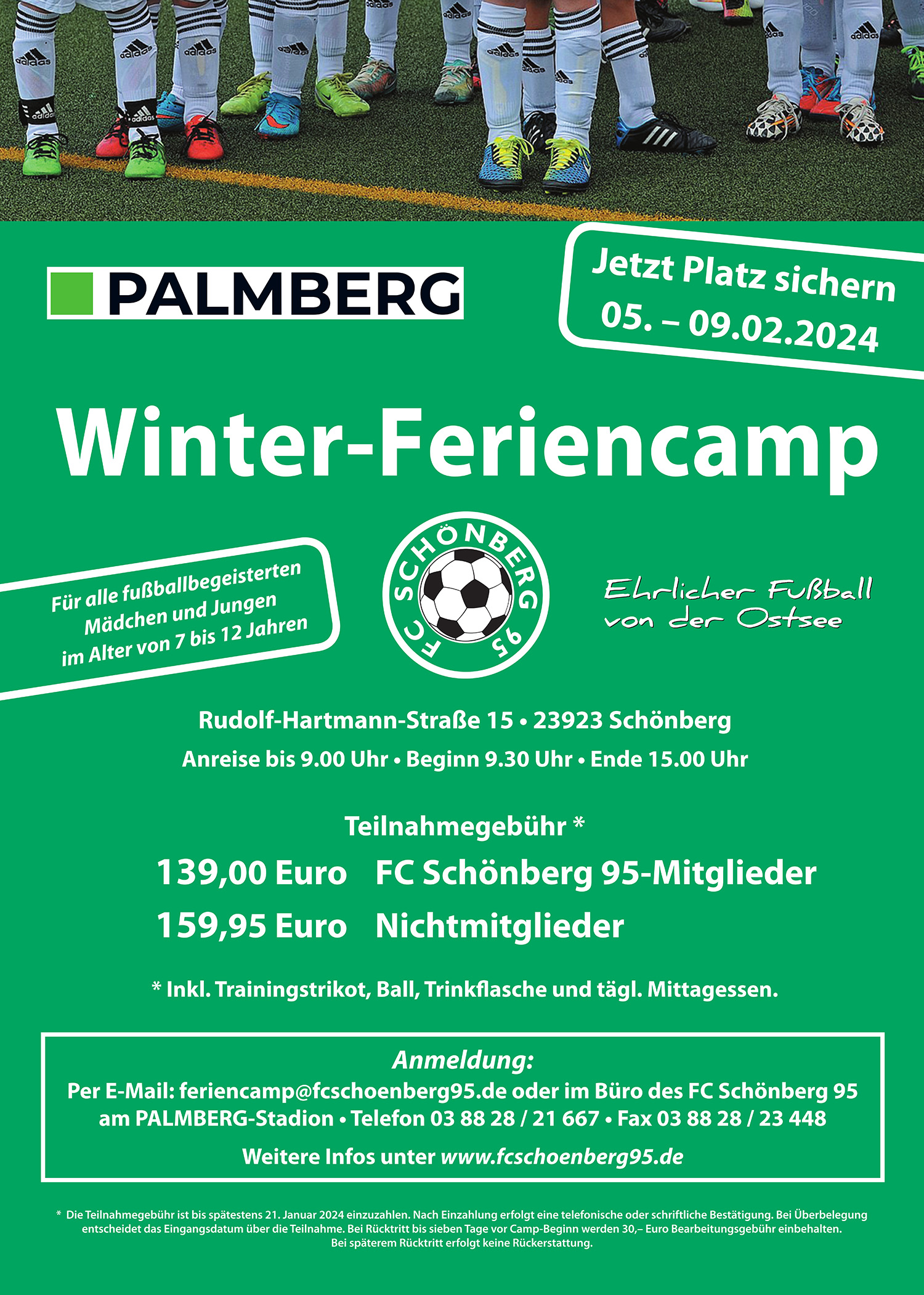 Ferienzeit ist trainingsfreie Zeit. Vor allem junge Kinder sind aber auch in dieser Zeit heiß darauf, sich in den Ferien zu bewegen. Eine ideale Möglichkeit dafür, den Kindern und Jugendlichen ein Fußballangebot zu unterbreiten, ist das vom FC Schönberg 95 organisierte PALMBERG-Winter-Feriencamp.